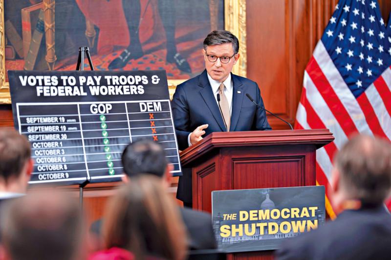 照片:美国发言人。众议院约翰逊13日在首都举行新闻发布会。 \ 美联社【大公报新闻】综合福克斯新闻及美联社报道:美国联邦政府自10月1日起关闭,至今已半个月。共和党众议院议长约翰逊13日表示,这次关闭可能是“历史上最长的一次”。财政部长贝桑特表示,这些停工停产开始影响国民经济。美国联邦政府最近一次、时间最长的停摆发生在2018年底至2019年初,也是在特朗普任期内,当时国会未能通过一项临时法案,其中包括在美墨边境修建隔离墙的费用,导致联邦政府关闭35天。众议院议长约翰逊13日继续将政府关门归咎于民主党,警告美国“正快速走向政府有史以来最长的一次关门”约翰逊表示,“除非民主党暂停对医疗保险相关福利的要求并继续政府运作,否则他不会进行谈判。”众议院民主党领袖杰弗里斯表示,民主党愿意坐下来谈谈,但解决方案肯定不会“通过一项临时拨款法案,然后先讨论医疗保健问题”。 “共和党人不可靠。” 参议院14日继续开会,当晚在帕纳南塔举行了第八次法案投票。联邦政府关闭的影响继续蔓延到美国各地。美国媒体报道称,空中交通管制人员的缺乏导致更多航班延误。 12日期间,全美各地近8000个航班延误,270多个航班取消。政府关门还影响到农民补贴和小企业贷款的支付。美国媒体教导说,双方都es拒绝在健康保险支出等关键分歧上做出让步,迅速达成妥协的前景微乎其微。