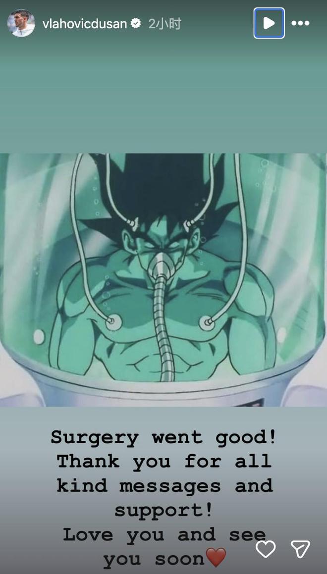 成功接受手术后,尤文前锋弗拉霍维奇在社交媒体上晒出一张《龙珠》角色悟空康复的照片,并表示手术进展顺利,感谢大家的支持。尤文图斯官方此前证实,队友弗拉霍维奇已成功接受手术修复撕裂的左内收肌腱。 Vlahovich在社交媒体上发布了一张《龙珠》角色悟空在治疗舱康复的照片,并写道:“手术很顺利!感谢大家的安慰信息和支持!我爱你们,很快再见❤️”