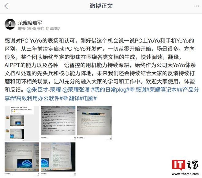 IT之家12月14日报道 荣耀全场景软件经理奚英俊昨天发文解释了PC端Yoyo和手机端Yoyo的区别。他说,三年前当他决定开始PC Yoyo的开发时,一切都是从零开始,遇到了很多情况,也有很多方向。我只是想借此机会谈谈PC端Yoyo和手机端YoYo的区别。三年前当我决定开始PC yoyo的开发时,一切都是从零开始的。有很多情况,也有很多方向。整个团队始终坚定致力于各种文档的生成、快速阅读、翻译、AIPPT能力以及各种智能控制计算机能力。这始终是comp yoyo系统的主要文档,未来我们会根据大家的反馈不断细化和关闭lo-loop相关场景,让AI能够全面融入到每个人的身边的学习和工作。据IT之家此前报道,今年2月,荣耀PC产品线总经理@朱辰才-荣耀发布视频介绍PC端yoyo助手2.0应用,支持场景化手势,新增语音交互功能,只需按一下F11即可立即唤醒智能助手。支持大小窗口模式切换,支持快速采集操作和暂停,实现主任务不间断、辅助任务及时响应的魔法。文本与系统层面交互,支持办公、浏览器、社交等。top100应用有20+个AI服务和4类AI服务卡。荣耀官网透露,Yoyo助手Windows版支持全系列电脑、Intel、AMD平台,适用于Windows 11及以上系统。已更新至9.0.2.52版本(SP2),提供智能搜索、Deepseek深度思考、AI创作、智能控制语言、魔幻文字勾勒、yoyo小窗互动等功能。