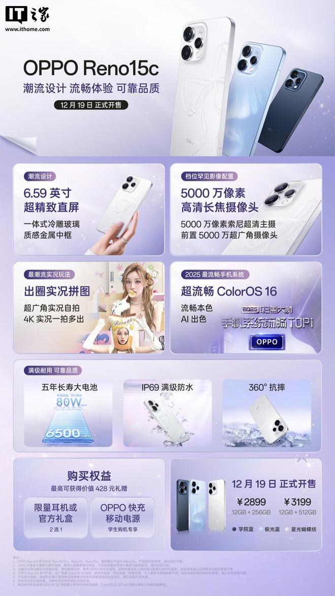 IT之家12月15日报道 据OPPO官方消息,OPPO RENO15C手机已开始预购,该机将于12月19日正式开售。IT之家注意到,OPPO RENO15C配备6.59英寸1.5K OLED Direct屏幕,支持120Hz高刷新率,拥有高频PWM调光技术。该手机采用一体式冷雕玻璃和纹理中框设计,有学院蓝、极光蓝和星光弓三种颜色可供选择。机身尺寸为宽74.83毫米,长158.00毫米,厚7.77毫米,重197克。性能方面,RENO15C搭载第四代骁龙7 CPU。成像方面,RENO15C配备了50像素长焦摄像头、50像素索尼主摄、8像素超广角摄像头、i50像素前置超广角摄像头。 RENO15C运行最新的ColorOS 16系统,具有实时拼贴功能,并且支持超广角直播自拍和4K直播拍摄。续航方面,OPPO Reno15C配备了6500mAh大电池,续航长达五年,支持80W超级闪充。同时,该手机还支持IP69完全防水和360°防摔。 OPPO RENO15C提供两种存储配置:12GB+256GB版本售价2899元,12GB+512GB版本售价3199元。