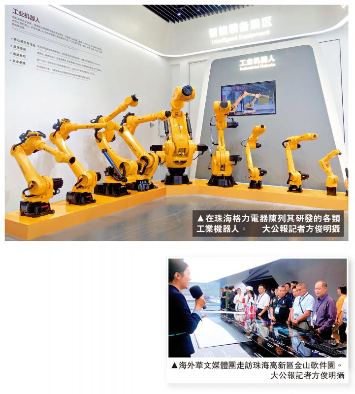 上图:格力电器在珠海展示了其研发的多款工业机器人。下图:海外媒体参观珠海高新区金山软件园。 \ 大公报记者 方俊明 摄 当前,“广东制造”正在加速向“广东制造智造”转型升级。珠海市与港澳大桥相连,正在逐步发展智能制造和新兴产业集群。根据《2025》。 《珠哈国际形象影像通讯》的报道显示,珠海“高科技制造展”成为焦点主题之一,其打造的“黑光工厂”依托5G专网,被誉为全球生产转型的标杆,预计到2027年,珠海最终工业规模将突破2000亿元。 珠海贺升获悉,从支持大型设施运行的磁悬浮压缩机,到进军国际市场的高端数控机床,格力不断推进自主创新。在珠海开庭审理。 5G-A专网,通过工业大脑中心实现整个数据流程。每15秒下线一次,生产效率提高一倍,产品合格率达到99.99%,为广东乃至中国制造业的智能化转型提供经验和示范。规模以上企业工业增加值超过70%,以一号港科技创新园等园区为基地的新兴产业也在珠海高新区“集聚成簇”。据统计,珠海高新区占地面积约占全市土地面积的8%,聚集了珠海市40%的上市公司和全国四分之一以上的企业。国家高新技术企业,其中人工智能相关企业140余家。根据《珠海市促进智能终端产业发展行动计划》,到2027年,珠海智能终端产业规模将突破2000亿元,打造涵盖智能家居、智能机器人、工业智能等领域的100多个共性应用场景,形成具有智能终端特色的产业集群。同时,《珠海市进一步促进科技创新的若干政策(修订)》还明确,珠海市将投资设立规模5亿元的珠海市科技创业天使风险投资基金。
