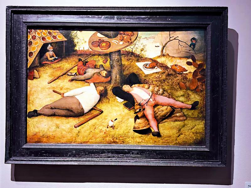照片:老彼得。勃鲁盖尔的画作《和平之地》。 \ 作者供图 近年来,出现了一个名为“平躺”的网络术语。它并不意味着躺在床上准备睡觉,而是包含着一种放弃努力和破坏的厌世状态。事实上,在十六世纪,荷兰绘画巨匠彼得就是长辈。老彼得·勃鲁盖尔的流派绘画素描《Het Luilekkerland》(荷兰语:Het Luilekkerland,英语:Cockaigne)也包含斜倚的场景,其深层含义也充满讽刺。距离我上次参观慕尼黑的 Alte PinakeThek 已经过去九年了。当我重游故地时,我对作品的很多关注和理解都不同了。这九年里,我完全被《伯老》的艺术成就所折服。沉醉于他画作中生动的活力、定制的记录、细节的细致呈现,以及他改造大量荷兰专业人士的高超能力。根据他对动词的熟悉程度将动词转化为图像。由于隔壁的新画廊最近经过几年的整修,馆藏中的一些经典作品已移至老画廊临时展出。近200件古代大师的杰作现已移至老画廊一楼展出,其中包括“隐藏”在狭长走廊中的勃鲁盖尔令人难以置信的“和平本质”。老彼得.勃鲁盖尔用他擅长的特写视角来表现这个略显幽默的场景。在画的中心,一张摆满餐具和食物的圆形餐桌被绑在山上的一棵树上。树下躺着三个身份不同的男人:右边是一个穿粉红色衣服的公务员,双臂交叉在右边,左边是一个穿着白衣的农民,旁边是一个穿着马裤、呈透视图的士兵。三个人中,只有那位公务员趴在纸笔上,直视着桌面。y,正当两人熟睡的时候。树下躺着的三个人的形状就像车轮的辐条。左上角堆满馅饼和汤的木棚下,还站着一个戴着铁盔的骑士,他的头贴在一起,张着嘴,好像要吞下什么东西。画面前景有一艘孤舟漂浮在河中,远处依稀可见小镇天际线的轮廓。与他现存的大多数作品一样,《波老》始终巧妙地将风景元素注入风俗画中。虽然他在绘画中经常被当作陪衬,但他对西方绘画发展的巨大贡献是毋庸置疑的。这幅画的标题是“幸福的国度”,其起源并非画中通常包含“兄弟”的荷兰谚语,而是来自中世纪的欧洲传说。对“和平之地”的最早描述来自于一份 13 世纪的手稿,由爱尔兰方济会基尔代尔修士迈克尔,现藏于大英博物馆。其开篇写道:“在西班牙西边的海上遥远的地方,有一个被称为‘和平之地’的国家。世界上没有其他地方可以与它相比,幸福指数和幸福指数也是无与伦比的。” 1790年,乔治.乔治·埃利斯所著的《早期英国诗人选集》中还收录了十三世纪法文版的《阿乐乡》这首诗,原文包括“房屋是用麦芽糖和蛋糕建造的,街道上涂满了糕点……馅饼和糕点里还填满了丰富的馅料、鱼和肉。”可见,中世纪欧洲的社会动荡和内乱让人们对美好生活产生了渴望。显然,前述的诗意记载与勃鲁盖尔前辈画作中的场景非常吻合。这是道德警告,而不是简单的享乐主义。一个有趣的细节是,如果你看这幅画,你会发现,虽然画中间躺着三个荷兰村民,但画中间“C位”的并不是一个人,而是一个夹着刀在奔跑的破碎蛋壳。如果仔细观察这幅画,画中还有很多“食物转移”的细节。 “鸡蛋手术”。画面右侧有一只烤鸡正试图站起来;后面,一只背上插着刀的烤猪正从山上流下来;左边木棚上张着嘴的骑士不是在等待馅饼或汤从屋顶上滑下来,让他坐下来享用,而是在等待面前的烤鸽子飞进他的嘴里(不幸的是,这只烤鸽子在之前的修复中没有被刻意去掉)。另外,屋檐下还有一大块切好的奶酪。英尺,围着香肠的栅栏,右边成堆的面包,桌子上散落着食物,最右边角落里拿着木勺的村民试图挤进“一个村镇”……老勃鲁盖尔试图运用所有天马行空的想象力。他用喜剧的表现手法描绘了他对“幸福国度”的个人态度——他鄙视人们天生的贪婪,并用“幸福国度”中看似难以言说的“自助餐”和无视享乐主义来讽刺致命罪恶中体现“贪吃”和“懒惰”的精神虚无,从而引发观者的反思。