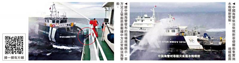 图片左:根据中国海岸警卫队发行的现场视频,菲律宾船3014号与中国海岸警卫队的正常执法碰撞。右边的图片:中国海岸警卫队根据法律违反菲律宾船只对水炮喷气机的控制。 \视频屏幕截图
