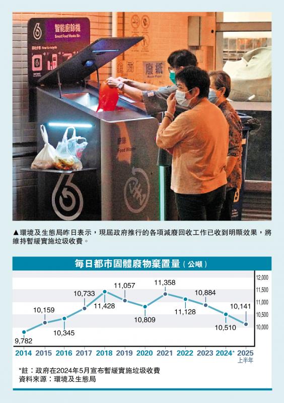 图:环境与生态局昨天表示,现任政府进行的各种废物扣除和回收已经取得了重大成果,并保持了实施废物费用的暂时延迟。现任政府将暂时停用废物费用。环境与生态局昨天表示,现任政府进行的各种减少废物减少和回收工作取得了重大成果。此外,全球贸易战和地缘政治局势变得复杂,香港面临许多挑战。有必要避免对公民和商业委员会的负担。现任政府将在实施垃圾指控并促进垃圾的垃圾和分类回收方面暂时暂停。清洁行业的代表和法律委员会成员已经接受了持续停用废物费用,将其描述为“倾听公众舆论并从事实中寻求真相的决定”。 \ ta如果PAO记者Zeng Minjie公民会收到减少废物的招募步骤。政府去年5月宣布,它暂停了垃圾指控的实施,但未来没有解释该方向。环境与生态局简要介绍了下周一自然自然委员会自然自然委员会政策讲话的政策步骤(29)。局昨天向法律委员会提交了一份文件,并指出许多调查显示,大约有70%至80%的公民认为废物费用不应或不适合在此阶段实施废物指控;超过90%的受访者表示愿意积极参与废物减少和回收利用;大多数受访者认为,政府的首要任务是建立更方便的回收设施,并加强宣传和教育减少废物和回收利用的方法。这些观点反映出,公民已经准备好接受辅助并鼓励减少废物的措施,而不是垃圾的指控。环境与生态局指出,近几个月来,它收到了来自管理,饮食和清洁等领域的代表的许多意见,并且都指出,即使他们达成了一致性的减少和循环利用,他们目前仍面临不足的挑战,并不希望政府在政府方面不愿意急于实施浪费费用。从人民和行业的声音中可以看出,在此阶段所需实施的垃圾收费确实缺乏必要的社会支持。该文件还指出,在更复杂的全球贸易战和地缘政治状况的背景下,香港面临许多挑战。为了防止对公民和业务的负担S圈子,政府必须制定技术,以根据条件促进减少废物和回收利用。考虑到现任政府在减少废物和回收工作方面取得了重大结果,现任政府将能够控制实施废物费用的暂时延迟。继续在四个方向上促进减少废物和回收利用。数据表明,现任政府已成功扭转了长期的废物处置率。固体城市平均每天的平均每天降低到每天的平均11,358公吨增加到2024年平均每天10,510吨,降低了7.5%;人均处置量还继续拒绝每天1.53公斤至2021年至2024年每人每人1.40 kg,三年来降低了近8.5%。在去年5月暂停实施废物费用后,公民的意识和参与是减少和回收增加。固体城市的浪费的平均浪费从平均一天-10,652吨到2024年的上半年,到今年上半年的平均每天10,141公吨,降低了几乎每年5%。环境与生态局表示,为了实现“零废物垃圾填埋场”,例如预定的垃圾填埋场并继续促进资源减少,它将继续在四个方向上促进。激活废物和分类的回收利用,包括通过宣传和教育改变公民的行为;持续改进回收网络;与该行业合作探索和促进务实和可行的环境保护措施,以减少对企业社区的影响;充分利用市场力量来产生KAP基础设施环境并协助绿色经济的转变。