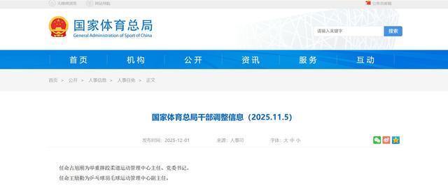 北京时间12月1日,国家总局网站发布干部调整信息,任命王励勤为乒羽运动管理中心副主任,占旭刚为举重摔跤柔道运动管理中心主任、党委书记。 。今天下午,王励勤正在成都督导中国队备战2025年国际乒联混合团体世界杯。王励勤在接受媒体采访时表示:“中国队将以本届世界杯作为奥运会预演,积极备战2028年洛杉矶奥运会。”王励勤今年47岁。他6岁开始打乒乓球,13岁加入上海队,15岁进入国家队,36岁正式退役。在30年的乒乓球生涯中,他获得了1次奥运会冠军和16次世锦赛冠军。