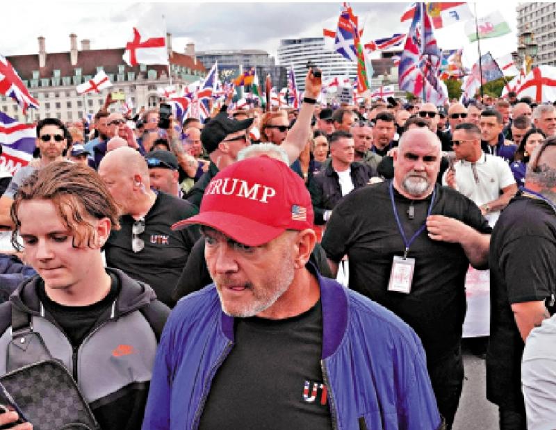 照片:右翼的人参加了13日的伦敦反移民示威活动,戴着一顶“特朗普”帽子。最近的民意调查显示,只有16%的英国人民对美国总统特朗普有着积极的看法,他在英国的受欢迎程度甚至比以色列总理内塔尼亚胡略低。但是英国媒体发现,特朗普领导的竞选活动“ Make Recreation(Maga)”反映了英国,越来越多的英国人在移民和变性者等问题上拥有与Maga支持者相似的保守立场。这位经济学家发现,英国人口的比例在MAGA支持者之间具有相似的立场,从年度的几乎季度增加到今年的36%。尽管2014年甚至低于40%,但由于“特朗普主义”,英国人表现出了合适的力量。特朗普的盟友和美国右翼互联网名人查理。柯克本月初与英国右gro丧生UPS为他举行守夜。英国极右翼的激进主义者汤米。鲁滨逊于13日在伦敦组织了一次大规模的反移民示威活动,柯克和玛加的照片符号也出现在现场。特朗普的前盟友通过视频链接“出现”,以激发英国人“改变政府”,并告诉抗议者:“暴力正在接近您。您可以战斗或死亡。”英国总理斯塔默(Stamer)在特朗普访问英国的前夕谴责马斯克的言论,并批评他敦促暴力行为。但是,一位热烈的发言人说,英国政府并不是要施加肌肉处罚。一些分析人士指出,斯塔默的政府面临严重的审判,例如缺乏英国经济增长和对涉及丑闻的内阁官员的辞职。特朗普的访问可能会暂时转移公众关注,并提供呼吸的雄鹿空间。 (综合报告)