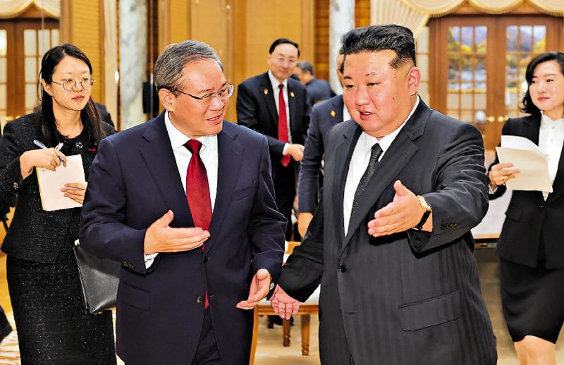 图片:当地时间9日下午,中共中央委员、国务院总理李强在平壤党委会见朝鲜党委书记、国务委员会秘书、朝鲜劳动党中央委员会委员长金正恩。 /新华社